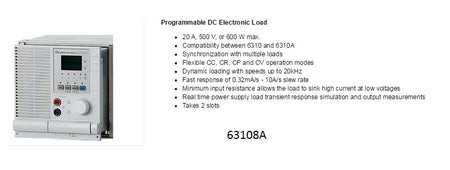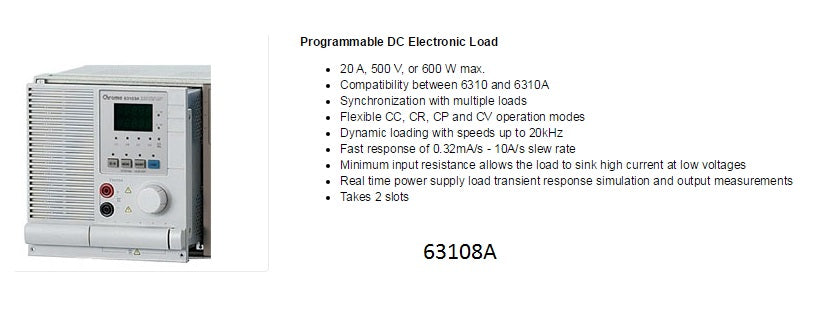 DC Load Module 20A/500V/600W. This module requires 2 available slots in the mainframe. The Chroma 6310A Programmable DC Electronic Load integrates microprocessor capabilities into each load module to provide simple and accurate parallel operations to optimize the speed and control among multiple load modules. All load modules may be configured to work synchronously or to test multiple outputs simultaneously, thus simulating real life applications.