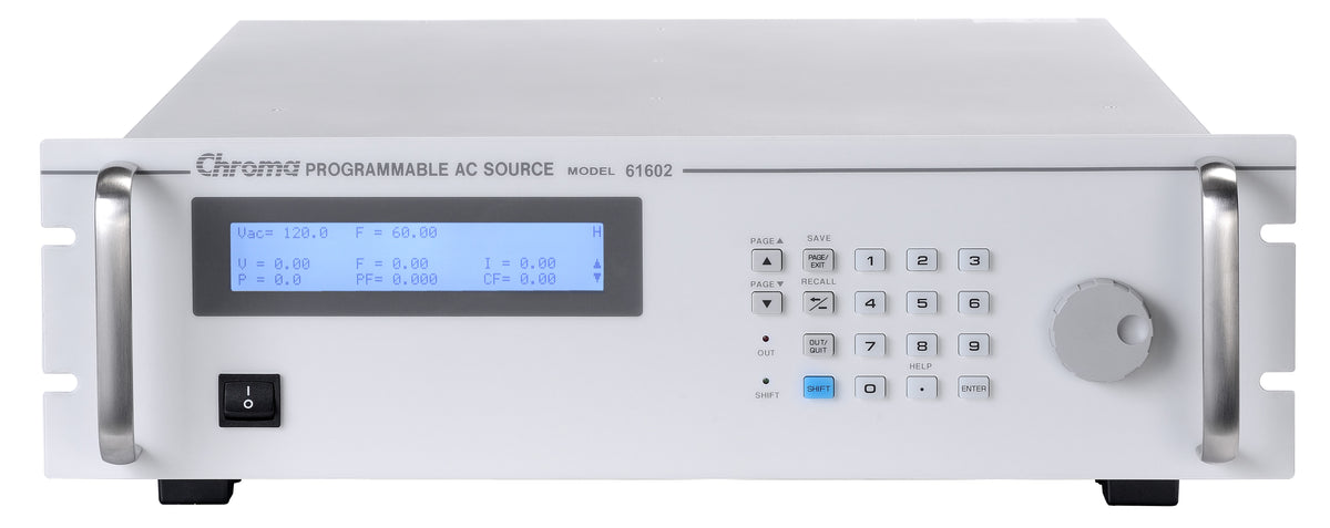 The Chroma 61601 500VA Programmable AC Power Source delivers single phase AC power at an unbeatable value. This versatile source offers an output voltage range of 0 to 300VAC and frequencies from 15 to 1000Hz, making it ideal for commercial, avionics, and military applications. From bench-top testing to mass production, the reliable 61601 is the right choice for consistent, precise power.